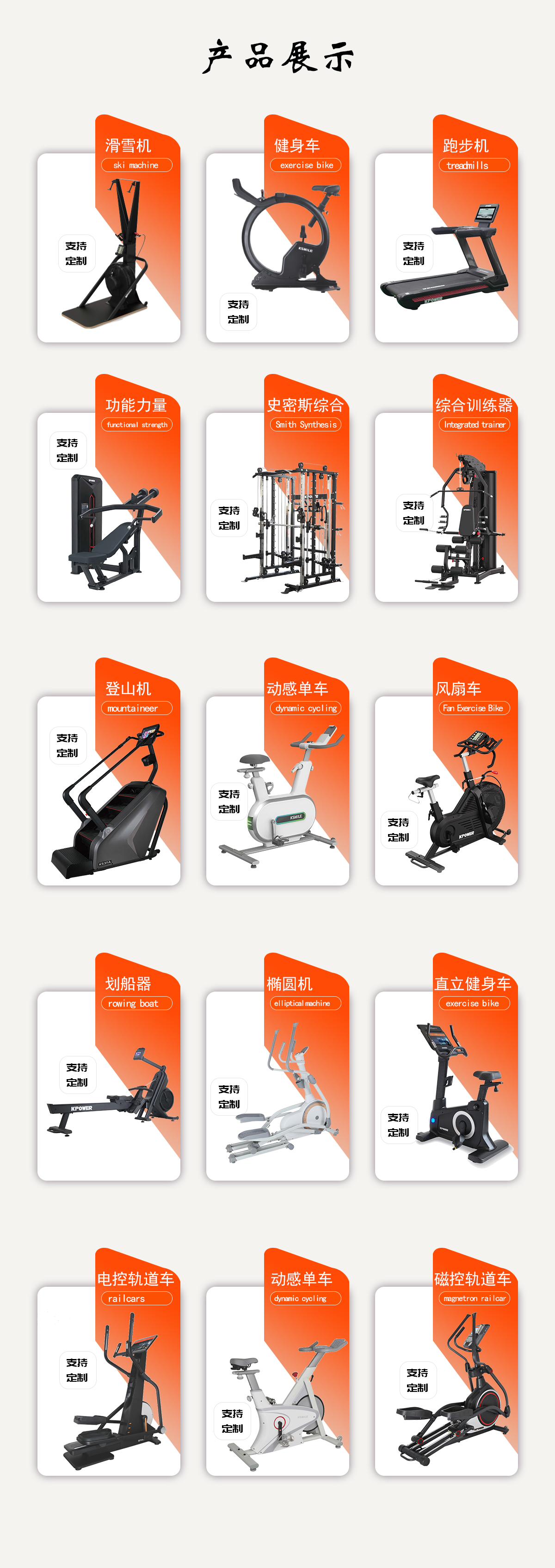 根據(jù)客戶不同需求進行產(chǎn)品個性化定制,跑步機、健身車、動感單車、橢圓機、劃船器、登山機、風扇車、滑雪機、史密斯綜合、綜合訓練器、多功能力量和單功能力量等各類健身器材