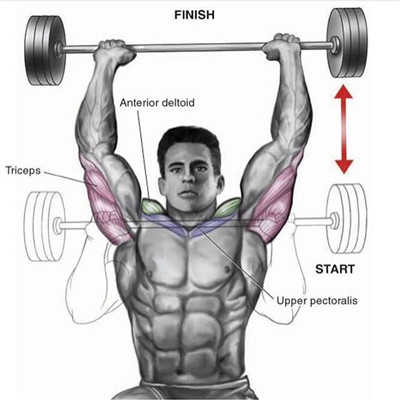 動(dòng)作1:坐姿杠鈴?fù)婆e,鍛煉三角肌前束和中束。