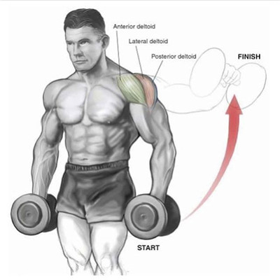 動(dòng)作5:直立啞鈴側(cè)平舉,鍛煉三角肌中束。