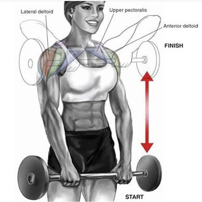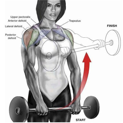 動(dòng)作6:直立杠鈴胸前劃船,鍛煉三角中束。