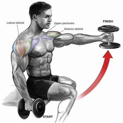 動(dòng)作7:直立啞鈴前平舉,鍛煉三角肌前束。