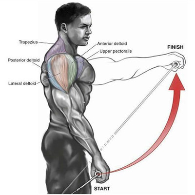 動(dòng)作9:直立拉力器前平舉,鍛煉三角肌前束。